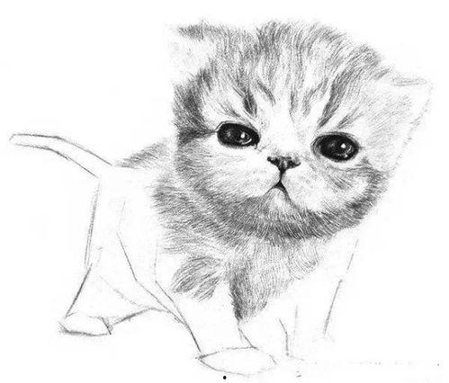 现在,让我们来画小猫的头部。首先,用铅笔画出小猫的轮廓,注意眼睛、鼻子、耳朵的位置。用细线条描绘出小猫的毛发,注意毛发的走向和层次。用橡皮轻轻擦去多余的线条,让画面更加干净。
